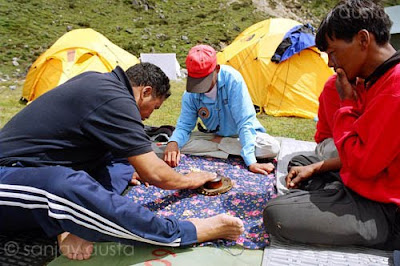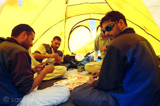 What spoils the shooting is the constant rain. It is a drizzle and sound pretty hard on our yellow North-Face tent. The evenings become somewhat dreary as the jawans crowd in the dining hall to watch hindi films. Today they have the projector and the big screen. But the most thrilled are the Sherpas, who watch the films with wonder and awe.