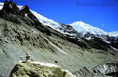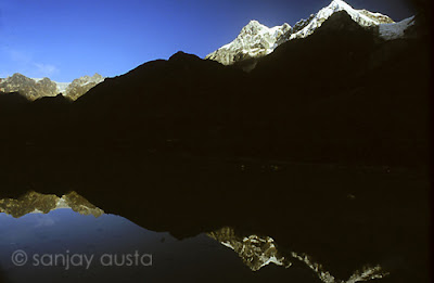 I am excited and eager to get as many shots I can this morning. We move for Base Camp today and I know there will never be as clear a view of Kanchenjunga from any other place, than this intermediate Base Camp. In my hurry, I drop the battery case of Nikon F-100 while changing battery. It shatters into two. I am lucky to locate the other piece among the big boulders where I stand my tripod. I tell myself to take it easy in such situations but my fingers are numb from cold and I can barely press the shutter and focus. The F-100 has a remote device for a shutter release and the army guys have lost it. I use the self-timer which is pretty time consuming. I manage to finish over 2 rolls before my fellow travelers begin to stir and peep out of their tents for tea and hot-water.
